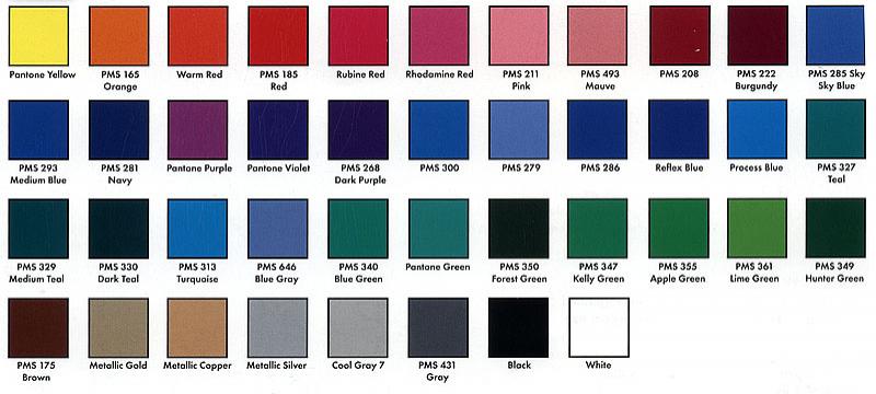 Bag Color Clear Clear Frosted White Black Ivory Gray Buff Orange Red Dark Blue Hot Pink Baby Pink Peach Dusty Rose Dark Green Teal 1st Ink Color ----------------- Pantone Yellow Orange 165 Warm Red Red 185 Rubine Red Rhodamine Red Pink 211 Mauve 493 PMS 208 Burgundy 222 Sky Blue 285 Med. Blue 293 Navy 281 PMS Purple PMS Violet Dk. Purple 268 PMS 300 PMS 279 PMS 286 Reflex Blue Process Blue Teal 327 Med. Teal 329 Dk. Teal 330 Turquoise 313 Blue Gray 646 Blue Green 340 Pantone Green Forest Green 350 Kelly Green 347 Apple Green 355 Lime Green 361 Hunter Green 349 Brown 175 Metallic Gold Ink Metallic Copper Ink Metallic Silver Ink PMS Cool Gray 7 Gray 431 Black White